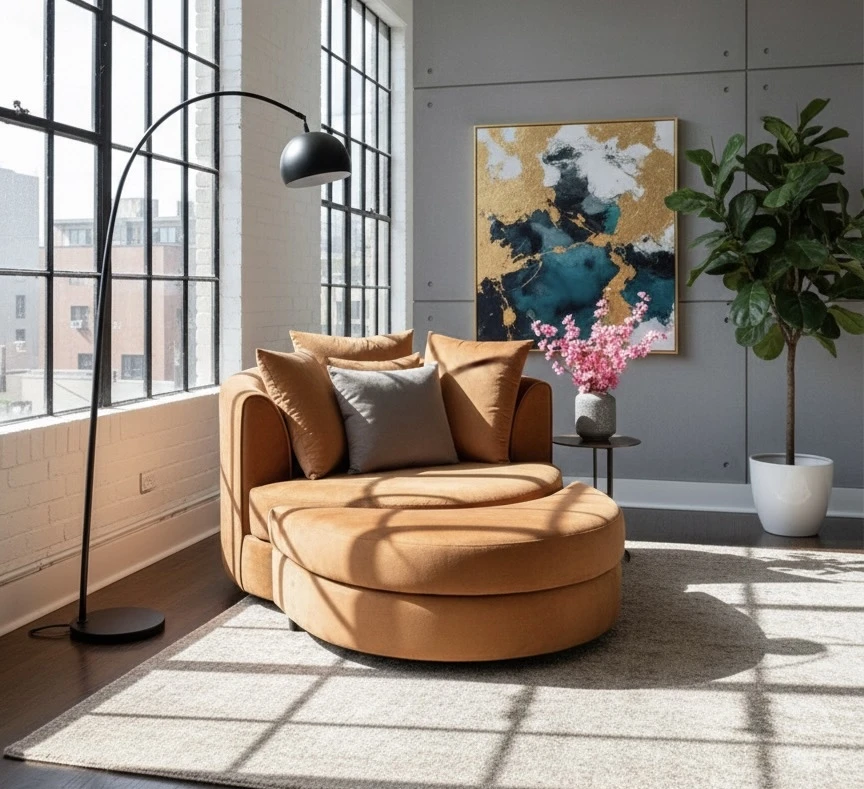 كرسي الاسترخاء الدائري الفاخر هو قطعة أثاث مصممة لتوفير الراحة المطلقة مع مظهر عصري مميز. تم تصنيع الكرسي من خامات عالية الجودة، حيث يأتي بمقعد عريض يمنح المستخدم مساحة كافية للاسترخاء، مدعومًا بوسائد جانبية ووسطية توفر دعمًا ممتازًا للجسم. تصميمه الدائري يمنحه طابعًا فريدًا يجذب الانتباه في أي غرفة، سواء كانت غرفة معيشة، غرفة نوم، أو مساحة استقبال راقية. الألوان الدافئة والخامة الناعمة تعزز من شعور الفخامة، بينما يمنح الهيكل الداخلي المتين ثباتًا وأمانًا طويل الأمد. يعد هذا الكرسي خيارًا مثاليًا لمحبي الراحة والذوق الرفيع في آن واحد.